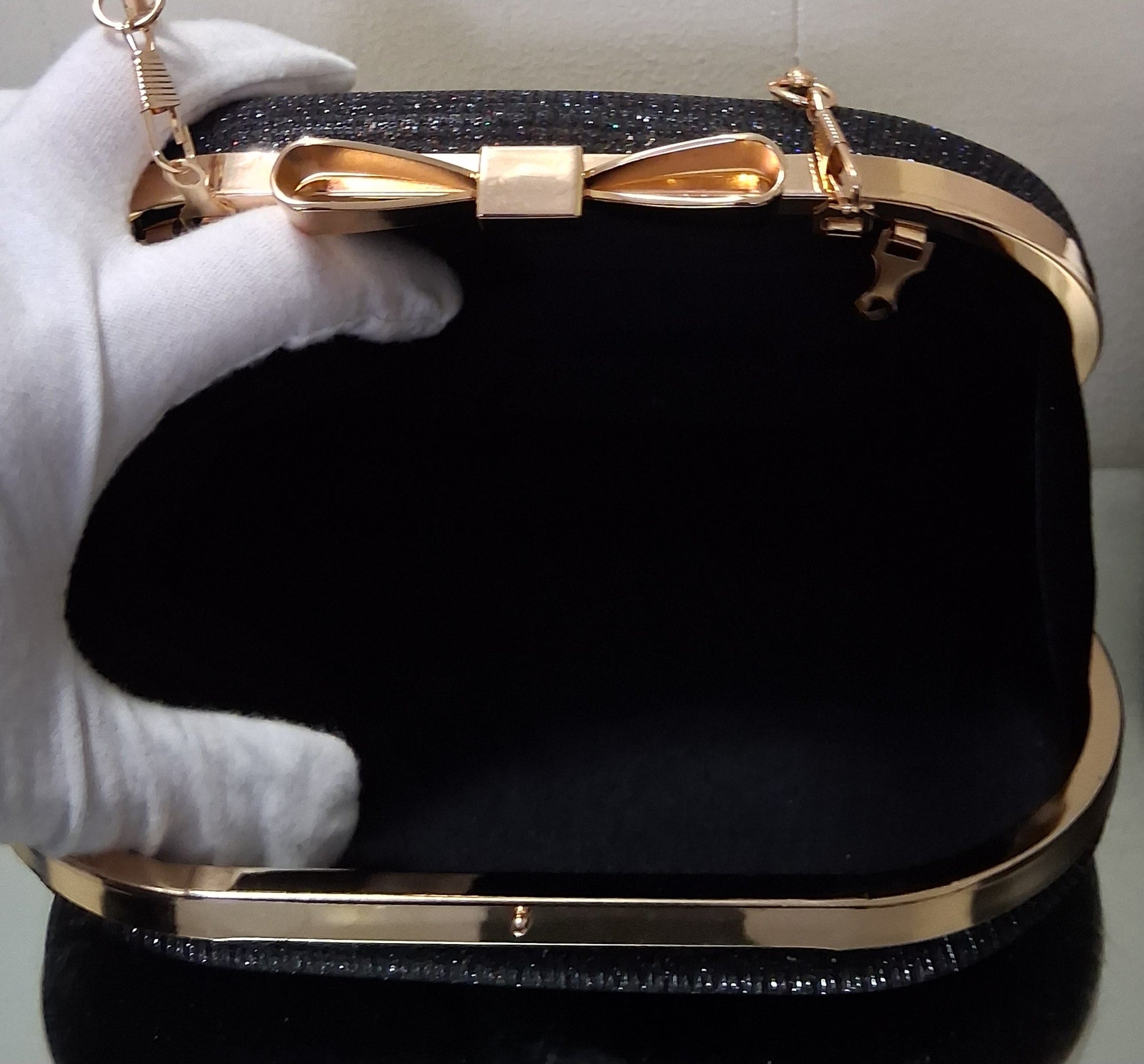 Stunning black sparkle evening clutch that's perfect for weddings, galas, and special occasions! This elegant hard-case clutch features a sophisticated gold bow clasp and detachable handle for versatile styling.