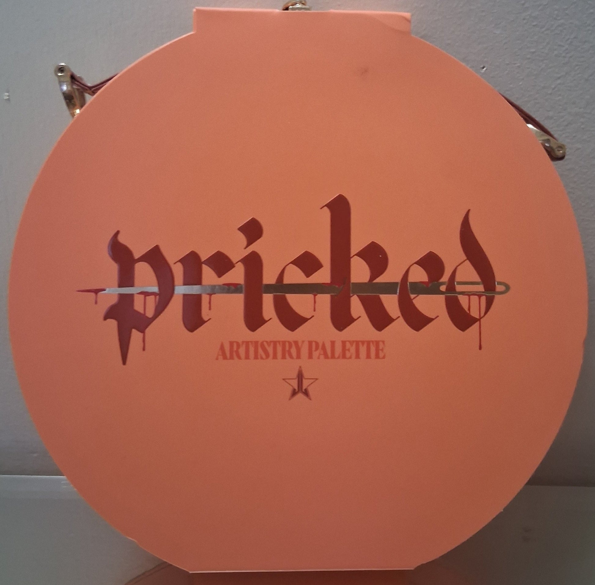 - Luxury Packaging - Stunning brown faux leather, round case, embossed signature gold barb wire heart on top with "Pricked" embossed in orange inside the heart. Palette has gold metal hardware, locking clasp, and leather strap handle