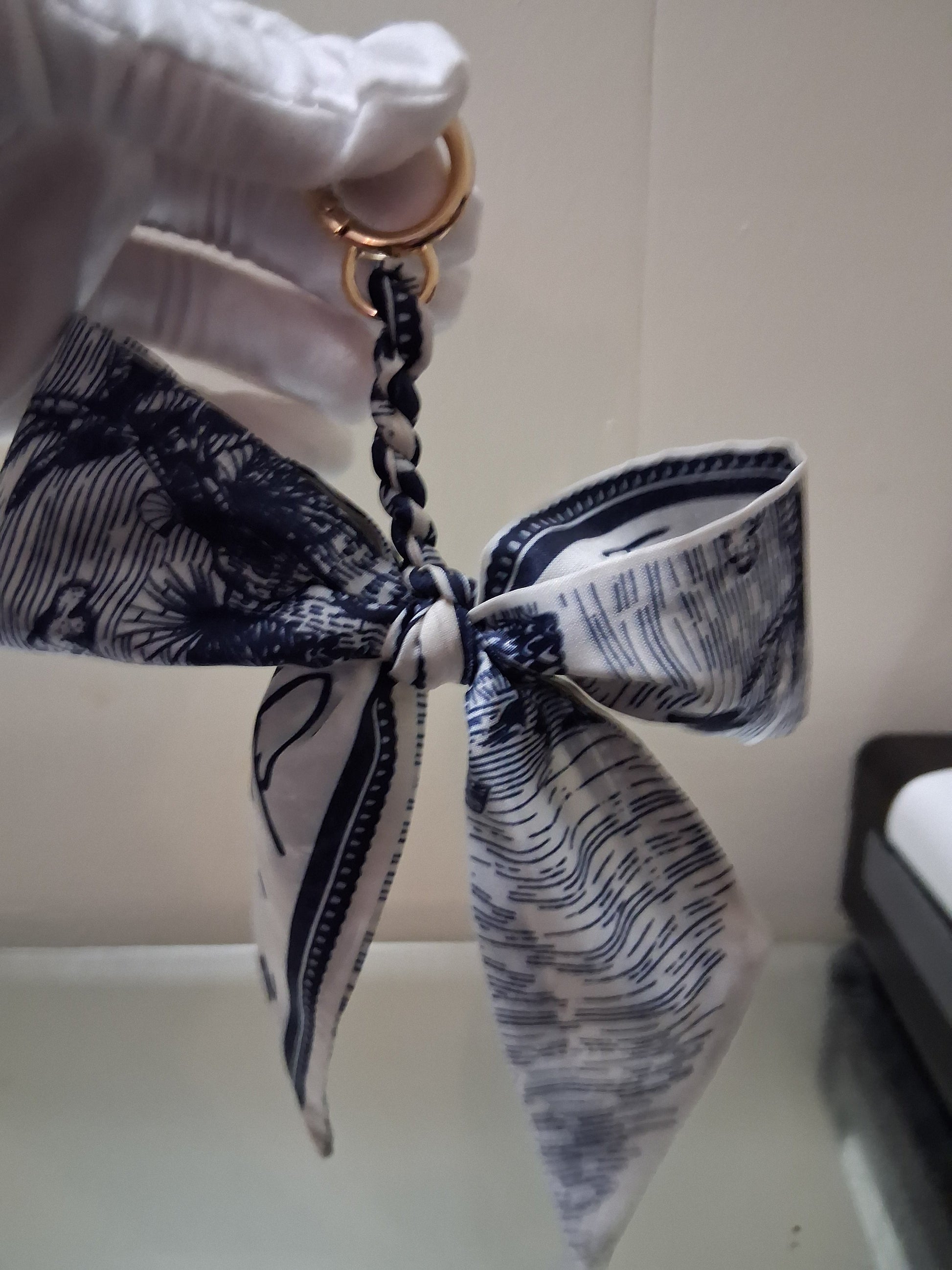Add a touch of elegance to any bag with this stylish decorative charm! Features a beautiful navy and white paisley scarf design with a gold-tone ring attachment.