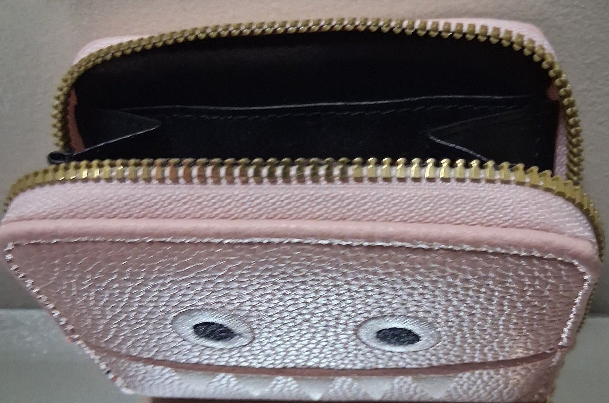Adorable and playful monster face wallet that's sure to bring a smile! This fun pink wallet features a cute monster design with googly eyes and gold chain trim.